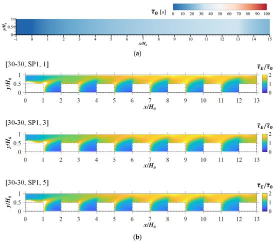 Furthermore, the relative enhancement or deterioration of the ventilation capacity due to the presence of buildings is assessed by calculating the normalized age of air. Instead of normalizing the effective age of air by a reference flow rate defined with the area of the windward entry of built area, as introduced by [], a reference case representing an open area without buildings was simulated. Adapted from the definition of air delay by Antoniou et al. [], this method also accounts for the streamwise accumulation of upstream pollutants. The contours of this non-dimensional index provide more intuitive references for urban planning.