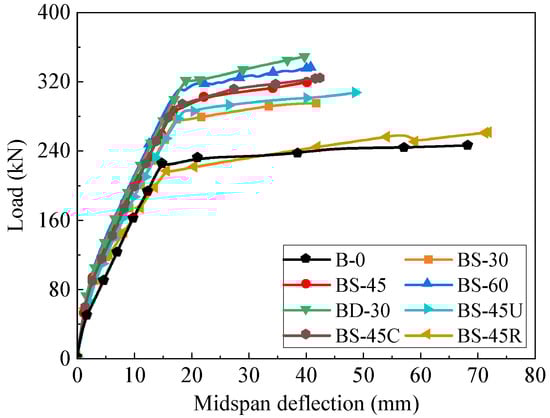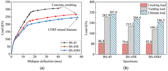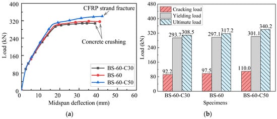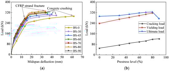 - Compared to beams with non-prestressed CFRP strands, applying prestress significantly enhanced the flexural behavior. The ultimate load increased from 291.3 kN to 324.6 kN as the prestress level increased from 0% to 80%. However, at a prestress level of 90%, the ultimate load decreased to 273.9 kN due to the premature fracture of the CFRP strands and no yielding of the non-prestressed steel rebars. Therefore, excessively high initial prestress in the CFRP strands should not be allowed in practical applications;