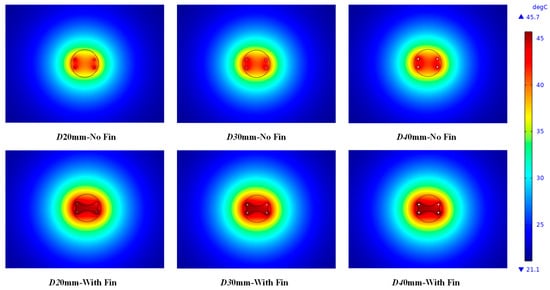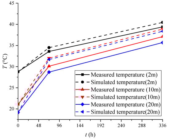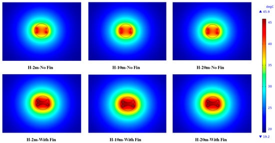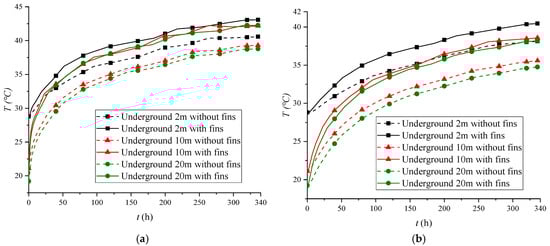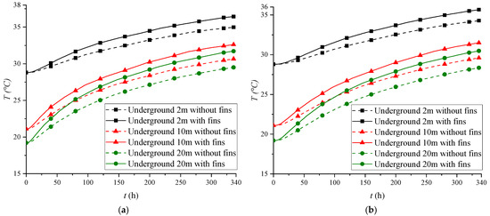 - The depth of the ground edge has a significant impact on the ground temperature within 8 m from the surface, while the ground temperature in the heterothermal zone (0–8 m) has little bearing on the enhancement of heat transfer through the installation of fins. After 336 h of operation with the fins set, the temperature of the concrete area grew by 15.8% to 24.9% within 20 m of the buried depth, and the temperature of the region surrounding the pile increased by 20.5% to 25.1%.