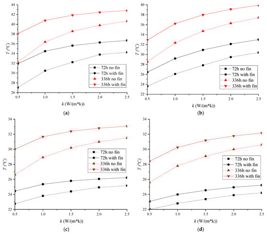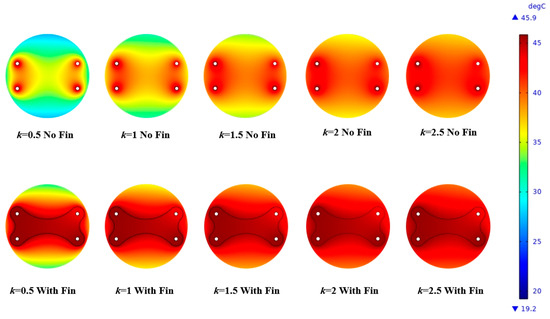 - When concrete’s thermal conductivity is adjusted between 0.5 and 2.5, the temperature in the heat transfer zone rises as the concrete’s thermal conductivity rises, but the temperature increment falls as the thermal conductivity rises. After putting the fins to run for 336 h, the temperature in the concrete area rises by 5.3% to 18.1%, while the temperature in the area surrounding the pile rises by 4.9% to 12.6%.