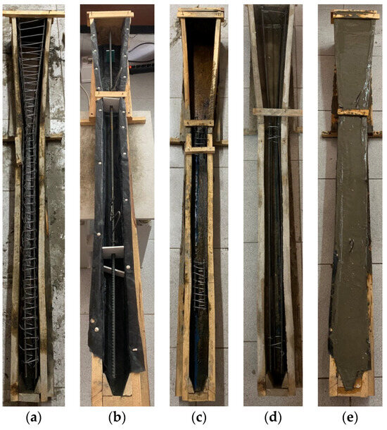 Appearance of pile models and segments filled with fiber-reinforced concrete. Pile Models: (a) SFC-1 and PFC-1; (b) SFC-2 and PFC-2; (c) SFC-3 and PFC-3; (d) SFC-4 and PFC-4; (e) filled with concrete.