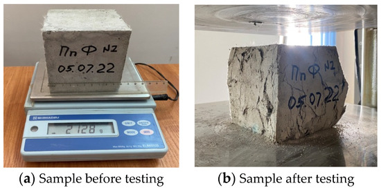 The strength of the concrete in the piles was assessed after the curing period through the testing of control samples made from the fiber-reinforced concrete mix collected during the pile manufacturing process. These control samples, measuring 100 × 100 × 100 mm, underwent compressive strength testing (Figure 5) using a hydraulic press P-125, produced in Russia. The tests were carried out in accordance with the standards outlined in [38].