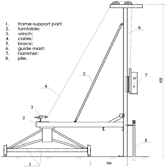 To drive and test the pile models, special experimental equipment has been developed and manufactured (Figure 6). The parameters, principles, and sequence of operations using this equipment are described in detail in the study [39].