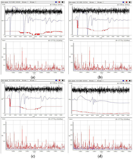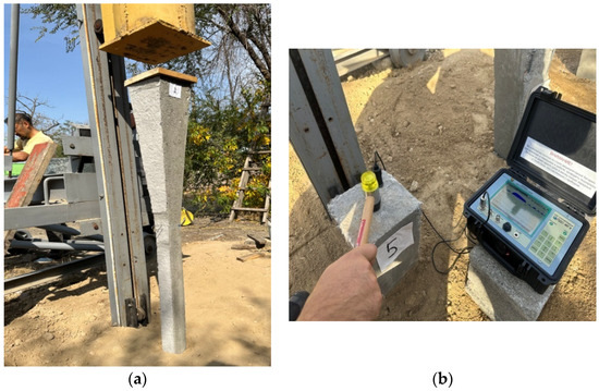 After the piles were driven, an instrumental diagnosis of the driving depth and localization of defects in the pile shaft was performed (see Figure 7) using the PDS-MG4 device (produced by LLC “SKB Stroypribor,” Chelyabinsk, Russia). The diagnostic work was carried out following the requirements of the PNST 804-2022 “Piles. Seismoacoustic Method for Controlling Length and Continuity” [41].