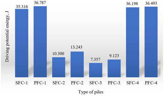 - Both the potential energy and the specific energy consumption during the driving of piles SFC-1, PFC-1, SFC-4, and PFC-4 were closely aligned, with differences not exceeding 4.1% and 3.7%, respectively.