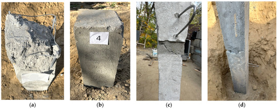 During the driving of piles SFC-2 and PFC-2, initial defects appeared as horizontal cracks with a width of up to 0.5 mm at the junction of the pyramidal and prismatic sections of the piles after 16–17 impacts of the hammer. Further increases in the number of impacts led to the widening of these cracks and a reduction of the piles’ penetration into the ground, ultimately resulting in their stoppage. When the number of impacts reached 35–45, the width of the cracks in the piles exceeded 2 mm, leading to a loss of integrity in the pile shaft, separating it into distinct pyramidal and prismatic parts (see Figure 9c,d).