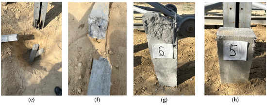 The driving of piles SFC-1 and SFC-4 was accompanied by damage to the concrete of the reinforcement in their head sections. At the end of the driving process, after the piles reached the required depth, the following defects were identified (see Figure 9a,g):