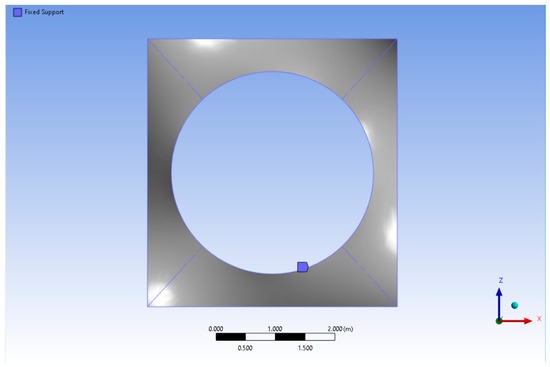 The modal and harmonic response analyses of the tensile membrane structure were conducted using ANSYS 2023 R1 Mechanical to investigate the dynamic characteristics of the structure under various conditions. These analyses are crucial for understanding the behavior of structures subjected to dynamic loads, such as wind-induced excitations, which can lead to resonance and instability if not properly managed. Modal analysis was used to identify the natural frequencies and vibration modes for the first six modes of the membrane structure. The results provided insights into how the structure would vibrate under external excitations. A finer mesh and accurate material properties were applied to capture the complex behavior of the membrane, ensuring the accuracy of these modal parameters. Proper boundary conditions were imposed, where the edges of the membrane were fixed to simulate the connections in real-world applications, as illustrated in Figure 2. Harmonic response analysis, on the other hand, assesses the steady-state response of the structure when subjected to periodic forces. This type of analysis is essential for understanding how the membrane will behave when subjected to harmonic excitations, such as wind loads, that typically occur at certain frequencies. It is particularly valuable for dynamic design as it helps determine whether the structure can withstand repetitive dynamic loads without experiencing significant deformation. In this case, a harmonic pressure load of 1000 Pa was applied uniformly across the membrane to simulate wind forces, and the damping ratio was set to 0.01, representing light damping conditions typical of tensile membrane structures. The boundary condition configurations were the same as the ones in modal analysis and ANSYS 2023 R1 Parametric Design Language (APDL) was utilized to introduce pre-strain into the membrane, replicating the initial tension typically observed in practical applications in both modal and harmonic response analysis.