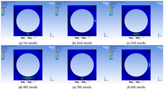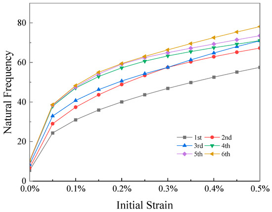 The influence of pre-strain on the natural frequencies of the tensile membrane was investigated, as illustrated in Figure 5. The first six natural frequencies exhibited a significant upward trend as the pre-strain increased. A marked increase was observed across all modes when the strain varied from 0% to 0.5%. For instance, the first mode’s natural frequency increased dramatically from 5.46 Hz at 0% strain to 31.0 Hz at 0.1% strain, representing an approximately 468% increase. Likewise, the second mode experienced a rise from 6.66 Hz to 37.4 Hz, an increase of around 462%, and the third mode shifted from 8.37 Hz to 40.76 Hz, signifying a 387% growth. This pronounced increase in natural frequencies indicates that the membrane structure became significantly stiffer with higher pre-strain, resulting in greater resistance to dynamic excitations.