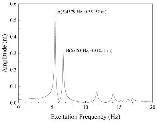 Frequency–amplitude curve of ETFE tensile membrane structure under 1000 Pa harmonic excitation.