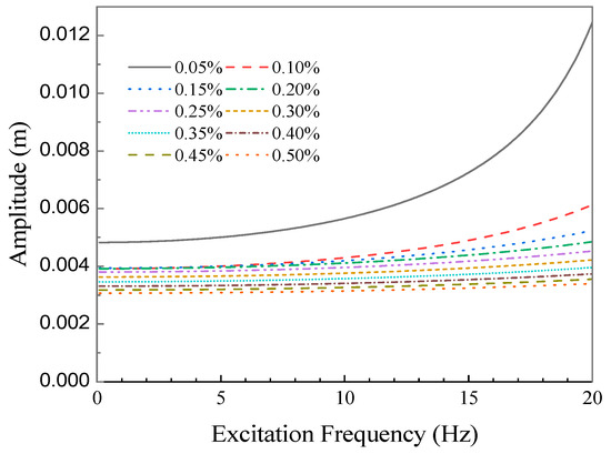 This effect was further corroborated by the frequency–amplitude response curve shown in Figure 6. Following the application of pre-strain, no resonance was detected within the 0 to 20 Hz frequency range of the harmonic pressure applied to the membrane surface, suggesting that pre-strain was effective in preventing resonance. The frequency–amplitude analysis also showed that the amplitude of the average deformation in the y-direction increased with the harmonic pressure frequency, peaking at 20 Hz. As the pre-strain was increasing from 0.05% to 0.5%, the deformation amplitude decreased from 0.012466 m to 0.0034 m, reflecting a substantial 72.2% reduction. This reduction highlights the enhanced stability and robustness of the membrane structure under dynamic loads. These findings are crucial for the design and optimization of tensile membrane structures, particularly when subjected to fluctuating wind and environmental forces. They demonstrate that raising pre-strain can effectively improve the membrane’s dynamic response, thereby reducing vulnerability to external excitations and ensuring structural integrity.