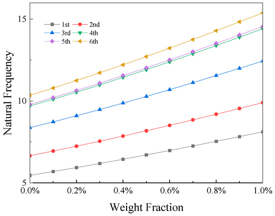 The influence of varying GPL weight fractions on the dynamic characteristics of the tensile membrane unit was quantitatively evaluated without applying pre-strain. Figure 7 illustrates the changes in the first six natural frequencies as the weight fraction of GPLs increased. A consistent rise in the natural frequencies was observed with the increasing weight fraction of GPLs, signifying a stiffening effect on the membrane structure. Specifically, as the GPL content increases from 0% to 1%, the first natural frequency grew from 5.4602 Hz to 8.1172 Hz, the second from 6.6601 Hz to 9.901 Hz, and the third from 8.3694 Hz to 12.443 Hz. This upward trend demonstrates the considerable stiffening influence introduced by GPL reinforcement.