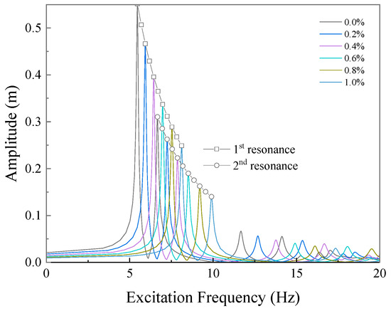Frequency–amplitude curves of GPL/ETFE tensile membrane in different pre-strain levels under 1000 Pa harmonic excitation.