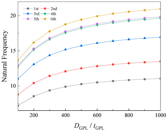 The next phase of the analysis was focused on examining the effects of the aspect ratio of GPLs on the dynamic response of the tensile membrane reinforced with 1% GPLs. The thickness of the GPLs was fixed as 5 × 10−8 m, while the diameter-to-thickness ratio varied between 100 and 1000. No pre-strain was applied to the membrane. As shown in Figure 9, increasing the GPL aspect ratio resulted in a consistent rise in natural frequencies for the first six vibration modes. Specifically, when the aspect ratio increased from 100 to 1000, the first natural frequency increased from 7.1963 Hz to 11.059 Hz, the second from 8.7778 Hz to 13.49 Hz, and the third from 11.032 Hz to 16.954 Hz. However, the rate of increase slowed down at higher aspect ratios, indicating a nonlinear relationship between the GPL aspect ratios and the natural frequencies.