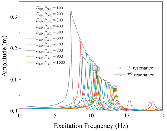 Figure 10 highlights the frequency–amplitude response and demonstrates the influence of the GPL aspect ratio on the resonant behavior. As the aspect ratio increased, the first resonance frequency shifted from 7.1932 Hz to 11.054 Hz, while the corresponding average deformation amplitude in the y-direction decreased from 0.31672 m to 0.13411 m. Similarly, the second resonance frequency increased from 8.7817 Hz to 13.496 Hz, with the deformation amplitude dropping from 0.17831 m to 0.0755 m. This reduction in resonant amplitude suggests that GPLs with higher aspect ratios offer a more pronounced stiffening effect, improving the overall rigidity and dynamic performance of the membrane. Thus, using GPLs with higher surface areas presents a more effective strategy for enhancing the structural resilience of ETFE membranes.