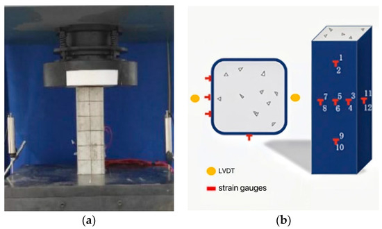 The axial compression test was conducted on a 5000 kN electro-hydraulic servo-controlled testing machine with a precision of 1 N. Two sets of 50 mm-range Linear Variable Differential Transformers (LVDTs) were placed on both sides of the specimen to monitor its longitudinal deformation and compression status. A schematic diagram of the loading setup and an on-site photograph are presented in Figure 2a. The data collection points on the stainless-steel tubes are illustrated in Figure 2b. Six sets of transverse and longitudinal strain gauges were attached to the adjacent rectangular surfaces of the specimen, specifically at the top, middle, and bottom positions. The transverse strain gauges, designated with odd numbers, were used to capture the hoop strain induced by the core concrete’s compression on the stainless-steel tubes, thereby assessing the confinement effect of the tubes on the core concrete. The axial strain gauges, designated with even numbers, were employed to analyze the development of the axial compressive deformation and local buckling of the stainless-steel tubes [27].
