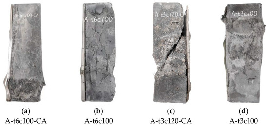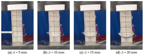After the specimens were fully loaded, a handheld cutting machine was used to cut through the external stainless-steel tube of the typical specimens, in order to further clarify the damage to the core concrete under different parameter conditions. The failure modes of all specimens can be categorized into two types based on the cracking of the core concrete: diagonal shear failure and bulging failure. Diagonal shear failure is characterized by diagonal cracks through the concrete, whereas bulging failure is manifested by the expansion of the stainless-steel tube due to confinement. Visual examples of these typical failure modes are shown in Figure 4.