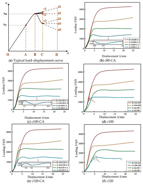 Figure 5 presents the load–displacement (N–Δ) curves for all square short-column specimens. Based on the development trend of N–Δ, these curves can be simplified into five development patterns, as shown in Figure 5a. The load–displacement curves can be divided into four stages: the elastic stage (segment OA), the elastoplastic stage (segment AB), the post-deformation stage (segment BC), and the strengthening/weakening stage (segment CD).