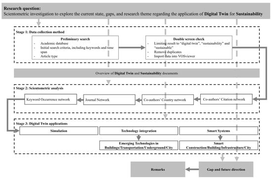 A systematic literature review was selected for this research as it is an effective method that provides a comprehensive perspective on previous research efforts [,] and builds upon the PRISMA checklist. This method also enhances our understanding of research trends and strengthens knowledge structures []. The research protocol, based on previous review-building development efforts [,,,,], is presented in Figure 1. Initially, a preliminary search was performed on the database, followed by a double-screen review. The scientometric analysis in the second stage aimed to develop bibliographic networks. In the final stage, the lifecycle of built environments was divided into four phases, which were thematically discussed.