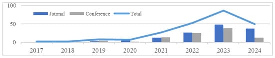 As illustrated in Figure 2, the trend of publications shows a surge across all types of papers starting from 2017 and peaking in 2023, where 36.6% of the total publications (86 out of 235) were recorded. Furthermore, 80% of all 235 published papers were produced during the last three years. Before 2017, research had especially been focused on developing DTs and the transformation of BIM into DTs and the principles of these technologies; meanwhile, research concentrating on sustainability was lacking. Therefore, this review covers almost all the research efforts on DT applications in sustainable built environments.