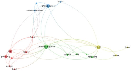 Table 3 provides detailed information about each country’s achievements in terms of citations and documents related to Digital Twin–sustainability knowledge. The United Kingdom emerges as the most active country in developing this knowledge domain, with 40 publications, 839 citations, and a total link strength of 23. Following closely are the next four active countries, including China (32 documents, 744 citations, and a total link strength of 22), the United States (30 documents, 172 citations, and a total link strength of 14), Italy (27 documents, 90 citations, and a total link strength of 12), and Germany (22 documents, 165 citations, and a total link strength of 7).