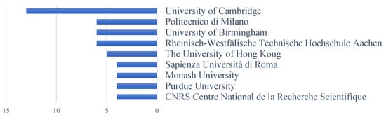 A co-authorship country network (Figure 3) was developed to discuss the countries with the highest contribution to knowledge in the field. Countries with more than five published conference and journal papers were explored without specific restrictions on citation numbers. A total of 20 countries were identified to have contributed to the construction of the network. In this network visualization, each node represents a country, and the links depict collaborations between countries. The size of each node reflects its contribution, with larger nodes indicating a higher number of published papers. Additionally, the analysis revealed that the University of Cambridge has published 13 papers focusing on Digital Twin–sustainability integration, making it the most prominent organization in this area. Following closely are Politecnico di Milano, the University of Birmingham, and Rheinisch-Westfälische Technische Hochschule Aachen, each with six publications. The University of Hong Kong follows with five publications (Figure 4).