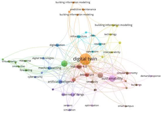 Based on Table 6, which provides information about the occurrence of each keyword and their network parameters, “Digital Twin” stands out with the highest frequency at 90 occurrences and a total link strength of 115. Following this, the next most frequent keywords are “Sustainability” (occurrence: 27; total link strength: 49), “Digital Twins” (occurrence: 26; total link strength: 31), “BIM” (occurrence: 19; total link strength: 39), and “Industry 4.0” (occurrence: 14; total link strength: 30). However, “Digital Twin” emerged in different terms, including “Digital Twins” and “Digital Twin (DT)”, and “BIM” was repeated through the phrasing of “building information modelling (BIM)”, “building information modeling (BIM)”, and “building information modelling”, emphasizing the leverage of the keywords.