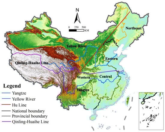 - The Three Major Regional Distributions in Eastern, Central, and Western China. Available online: https://www.resdc.cn/data.aspx?DATAID=277 (accessed on 29 August 2024).