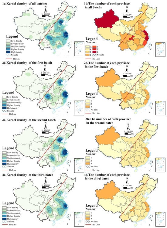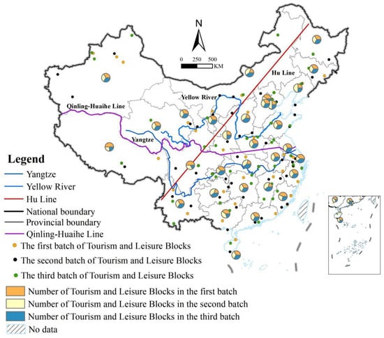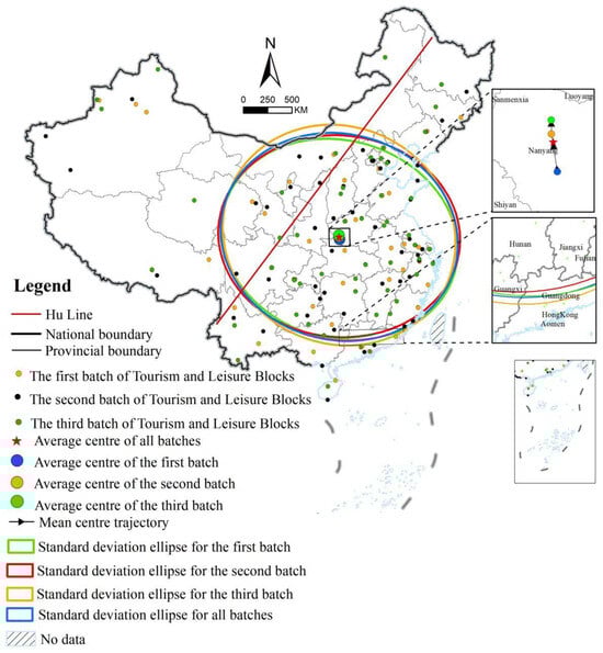 - Spatial Distribution of Tourism and Leisure Districts: China’s tourism and leisure districts demonstrate a spatial pattern with a higher concentration in the southeast and lower density in the northwest, as well as a greater number in the south compared to the north. Specifically, 81.10% of districts are situated in the southeastern half of the country, while the northwest accounts for only 18.9%. Similarly, 55.49% of districts are found in southern regions, compared to 44.51% in northern areas. Eastern regions lead in tourism development, especially within the Yangtze River Delta and Beijing–Tianjin–Hebei urban clusters. The geographical center of these districts lies in Nanyang, Henan Province, though it has gradually shifted northward across the three batches of district designation, with the range of distribution initially expanding and then contracting.