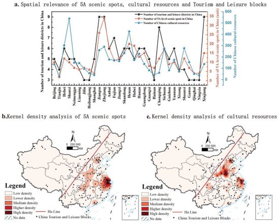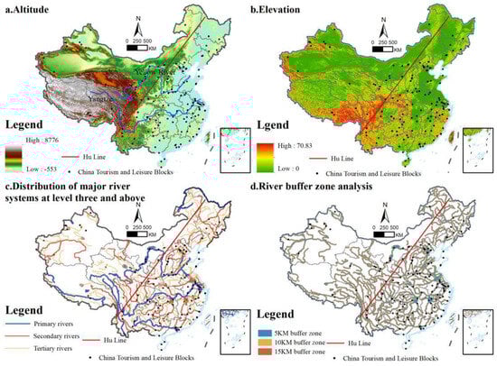 - Influencing Factors on the Distribution of Tourism and Leisure Districts: Several factors significantly impact the spatial distribution of these districts. Most districts are located in low-altitude regions (0–500 m), accounting for 66% of the total, and are situated on relatively flat terrains (0–5° slope), encompassing 95.12% of all districts. Additionally, districts tend to be near major rivers (within 15 km) and national highways (within 10 km). Regions with higher economic development, such as the Beijing–Tianjin–Hebei, Yangtze River Delta, and Chengdu–Chongqing urban clusters, contain more tourism districts, especially those close to administrative centers (within 80 km of provincial capitals and 40 km of ordinary cities). Population size and the richness of tourism resources are also key factors in the distribution of these districts, particularly in Jiangsu, Zhejiang, and Shanghai.