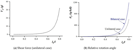 According to Equations (13) and (14), the shear of the buried rigid pipeline with unilateral void is related to three factors, namely, the void length, the pipe length, and the overlying load (see Figure 5a). Additionally, the relative rotation angle of the joint is also influenced by pipe diameter and foundation stiffness, besides the above factors. Both shear force and rotation angle are positively correlated with the overlying load. When the void spans the joint symmetrically, the shear force is zero, but the rotation angle is greater compared to a unilateral void and negatively correlated with the pipe diameter (as shown in Figure 5b).