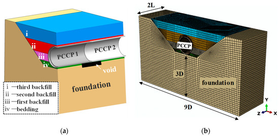 Since the relative rotation angle of the joint serves as a critical safety indicator for segmented pipelines, longitudinal non-uniform support caused by a local void spanning the joint is relatively unfavorable. PCCP pipelines are segmented with rigid pipes connected by flexible joints; therefore, the qualitative assessment results above serve as a reasonable reference. To quantitatively analyze the impact of a localized soil void on stress response and materials damage to PCCP, an FE simulation model including pipes and the surrounding soil was developed in the following section.