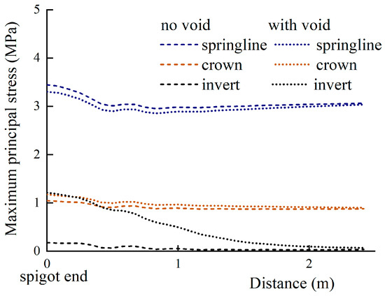 The void primarily affects the circumferential stress of the concrete core, reducing the circumferential compressive stress by approximately 0.9 MPa at the outer side of the pipe invert (see Figure 11a) and by 0.6 MPa at the spigot and bell ends (see Figure 12a). The circumferential distribution on the inner is opposite to that on the outer path. The circumferential compressive stress at the invert of the inner concrete increases because of the void, with rises of about 0.7 MPa at the spigot (see Figure 11b) and 0.8 MPa at the bell end (see Figure 12b). Notably, the maximum principal stress of the inner spigot end (Figure 11b) and the outer bell end (Figure 11a) is tensile. The value of the inner spigot end is about 2.4 MPa, but it does not reach the tensile strength of the concrete. In conclusion, the soil void affects the circumferential stress of the concrete core, which remains compressive. Namely, the void does not cause crack damage to the concrete but rather alters its stress distribution. The potential damage to the material is mainly the crack of the mortar protective layer.