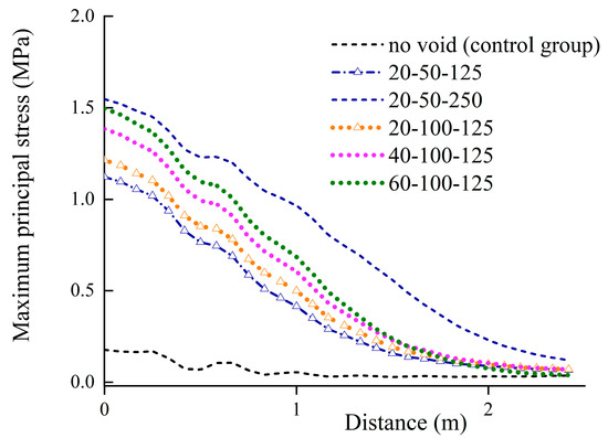As seen in Figure 8, the most vulnerable location in a local void is the pipe invert. In order to evaluate the impact of void evolution on pipe stress, the maximum principal stress is extracted for varying void sizes, as illustrated in Figure 9. The presence of a local void in the bedding results in an increase in the maximum principal stress at the pipe end (above the void), with the increment gradually decreasing along the longitudinal direction away from the void. The size of the void has a significant effect on the maximum principal stress, with void length exerting a greater impact compared to the depth and angle. A longer void length results in a larger longitudinal response range. When the VL reaches 2.5 m, the maximum principal stress increases by approximately 8 times compared to the case with no void.