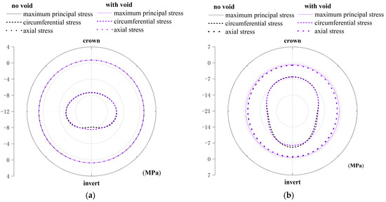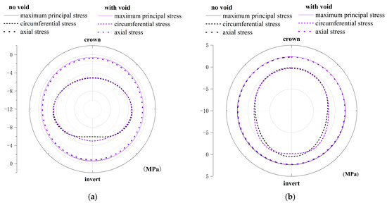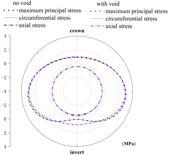 Differing from the mortar, the maximum principal stress of the concrete core is basically equal to the axial stress, indicating that the direction of the maximum principal stress is axial and evenly distributed along the path. Figure 11 and Figure 12 illustrate the impact of a void on concrete stress at the spigot and bell ends, respectively. The concrete core experiences circumferential compression due to prestressing. The compressive stress resulting from prestressing is greater than the circumferential stress under the operation loads, maintaining a compressive state in circumferential stress.