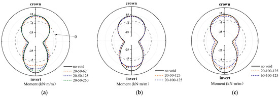 Effect of void size on the moment of the concrete at bell end: (a) VL, (b) VD, and (c) VA.