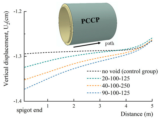 The vertical displacement of the pipeline is about 1.3 cm under operational loads. During service, adverse operational conditions may create localized ground voids, causing unsupported soil and subsequent pipe displacement. Figure 15 shows the vertical displacement of pipe with different soil void sizes. It is evident that the void causes vertical displacement, and the closer to the void, the greater the displacement. When the void is 20-100-125, the maximum vertical displacement of joint reaches about 1.33 cm. With the continuous expansion, the vertical displacement increases, and the displacement increases to about 1.38 cm when the void evolves to 90-100-125. Consequently, the local soil void in the bedding can cause vertical displacement of the pipe, while the displacement due to void is quite small and can be ignored for large-diameter PCCP.