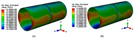 PCCP is a composite material pipe, and the cracks on the mortar layer and concrete are the initial signs of pipe damage. The maximum principal strain of the mortar with (the void size is 20-50-250) and without (operation condition) void is shown in Figure 17. The PCCP exhibits an “elliptic” deformation under operational loads, with the maximum principal strain of the mortar layer measuring approximately 160 με at the pipe springline and about 10 με at the pipe invert. The local void changes the stress state of the pipe, and the maximum principal strain slightly increases to about 165 με and 60 με at the waist and invert, respectively. The values remain significantly below the specified limit for mortar crack damage [27].