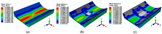 Shear failure nephogram of the bedding soil: (a) operation condition, (b) void production, and (c) void evolution.