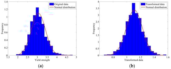 To investigate the effectiveness of the dual power transformation, the first example uses the practical data of H-shape structural steel collected by Ono et al. (1986) [], and the number of data of the yield stress is 2195. The first four moments of the yield stress can be estimated as μX = 3.0547; σX = 0.3641; α3X = 0.5116; α4X = 3.9573. The first four moments of the transformed date are μX = 1.1097; σX = 0.1187; α3X = 0.06547; and α4X = 3.473039. Figure 2a,b show the histograms of the original data and the transformed data, respectively. It can be observed from the figures that the histogram of the transformed data fits the normal distribution better, while the original data shows some deviation from normality. Additionally, Figure 3a,b present the Q−Q plot and P−P plot of the transformed data, both of which indicate that the transformed data exhibits improved normality. This example demonstrates that the dual power transformation can effectively normalize skewed data.