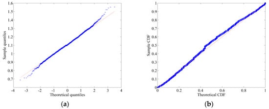 (a) Q−Q plot of the transformed data; (b) P−P plot of the transformed data. Normality test.