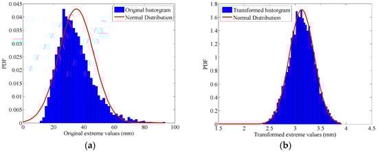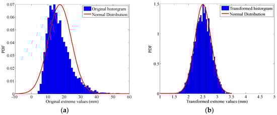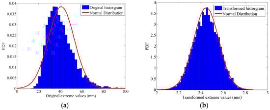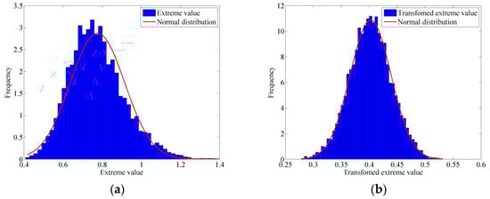 (a) Histogram of extreme value; (b) Histogram of transformed extreme value. Comparison of histogram of extreme value and transformed extreme value.