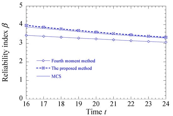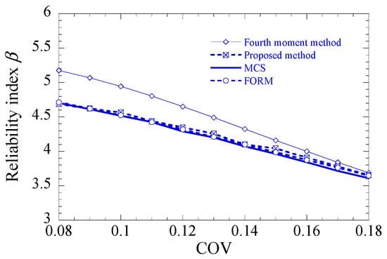 in which is the reliability index estimated by the proposed method or fourth-moment method, and denotes the reliability index obtained from the Monte Carlo simulation (MCS). Table 2 presents the first four moments and reliability index obtained using the proposed method, along with the results from MCS and the fourth-moment method. As shown in Table 2, the first four moments obtained using the fourth-moment method closely match those obtained via the MCS method. However, the calculated reliability indices show a significant difference, with a RE of 9.43%. The skewness and kurtosis calculated by the proposed method are approximately 0 and 3, respectively, and the calculated reliability index aligns more closely with the results obtained by the fourth-moment method, with a RE of 1.09%. This is because the proposed method transforms the original limit state function into one that more closely follows a normal distribution, thereby avoiding errors associated with calculating high reliability indices (reliability index greater than 3) in skewed situations. This highlights the effectiveness and accuracy of the proposed method.
