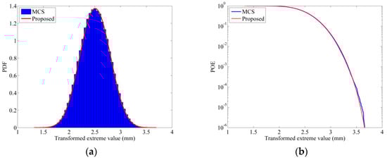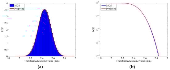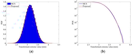 Utilizing the first four moments from Table 8, the transformed extreme value distributions (TEVD) and the POE curves were obtained. Figure 12, Figure 13 and Figure 14 depict the results for the first, fifth, and tenth layers, respectively. The curves generated by the proposed method exhibit excellent agreement with the MCS results, confirming the method’s effectiveness and precision in dynamic reliability analysis.