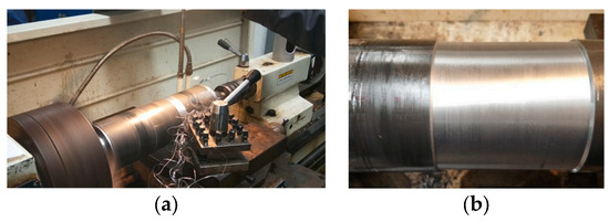 Pictures of the turning in situ and turned steel tube. (a) Turning in situ. (b) Turned steel tube.
