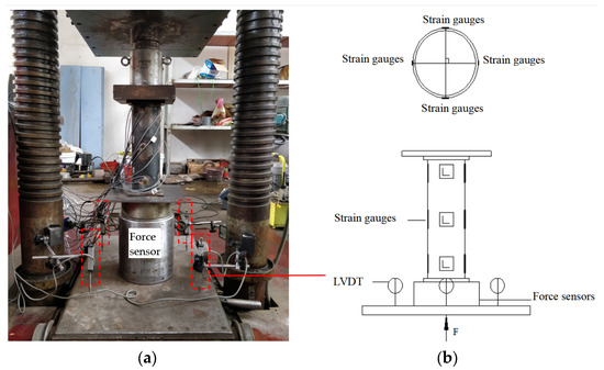 The axial compression tests were conducted using a NYL-500 hydraulic testing machine manufactured by Changchun Material Testing Machine Factory in Changchun, China. To precisely monitor the strain in various regions of the locally corroded CFST columns, four sets of right-angle strain gauges were symmetrically placed at the center of the corroded area, the center of the non-corroded area, and the boundary of the corroded region. Additionally, four three lateral linear variable displacement transducers (LVDTs) were installed at the bottom of the loading end. Strain and displacement data were automatically collected by a computerized data acquisition system. The arrangement of the specimen loading device and measurement points are depicted in Figure 4. The test employed a stepwise loading protocol, with each load level in the elastic phase being 1/10 of the design capacity, transitioning to 1/15 of the design capacity in the elastic–plastic phase, and each level being maintained for 2 min. As the load approached the design capacity, a slow and continuous loading rate was applied. If the load decreased to 75% of the theoretical estimated ultimate load capacity or excessive deformation occurred, the specimen was considered damaged, and the test was terminated immediately.