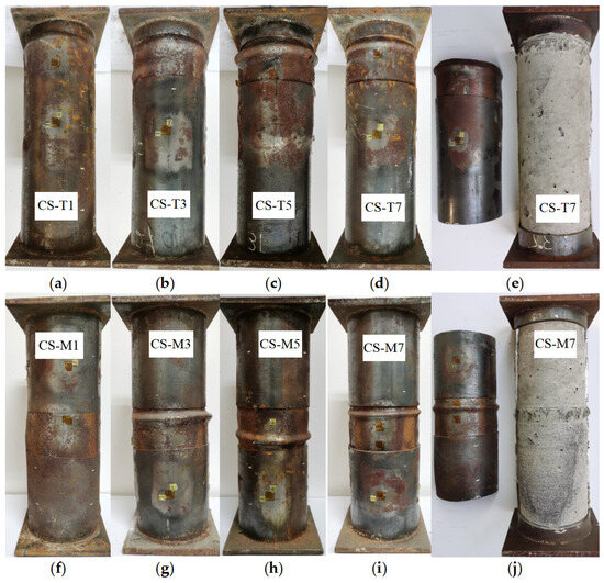 Failure modes of CFST specimens. (a) = 10%. (b) = 30%. (c) = 50%. (d) = 70%. (e) Typical damage patterns of core concrete. (f) = 10%. (g) = 30%. (h) = 50%. (i) = 70%. (j) Typical damage patterns of core concrete.