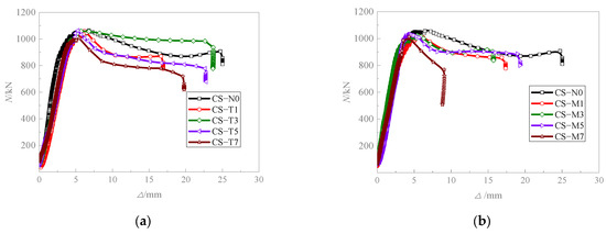 Figure 6 presents the axial load–displacement curves for locally corroded CFST columns. When compared to the uncorroded specimen CS-N0 whose load-bearing capacity is 1064 kN, the reduction in load capacity for members with a corrosion rate η of 10% or less (φT ≤ 50%) is minimal, with a decrease of less than 4.1%. At a corrosion rate of 14% (φT = 70%), the bearing capacity reduction is more pronounced, with decreases of 7.6% and 4.79% observed for end and middle corroded members, respectively. Upon analyzing the curve’s behavior in the Figure, it is evident that when the overall corrosion rate of a specimen is low, the change in mechanical properties due to corrosion is subtle. As the corrosion rate increases, the more pronounced is the reduction in load carrying capacity. Notably, the ductility of specimens with end corrosion is more substantially affected than that of those with middle corrosion. For middle corrosion, although it has an impact on the confinement effect of the core concrete, the confinement of the steel tube in the middle part is relatively weak. Hence, middle corrosion has a relatively smaller influence on the ductility of the specimens. Additionally, middle corrosion has a relatively smaller impact on the bonding performance between the steel tube and concrete. In contrast, end corrosion not only affects the confinement effect at the ends but also may lead to a significant decline in the bonding performance between the steel tube and concrete. This further reduces the ductility of the specimens.