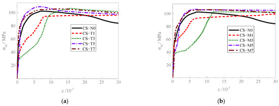 Stress–strain curves of corroded CFST. (a) End circumferentially fully corroded specimens. (b) Middle circumferentially fully corroded specimens.