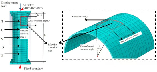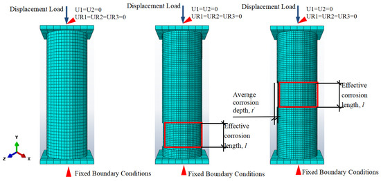 The computational mechanical model of the CFST column is constructed as a three-dimensional entity and uses C3D8R solid elements. The mesh density is increased in the corroded zone of the steel tube to achieve higher precision in the numerical simulation results. The interface contact between the steel tube and concrete is face-to-face. Along the normal direction of the contact surface, hard contact is assumed. While along the tangent direction, bond–slip contact is assumed, and the penalty function of the Coulomb friction model with a friction coefficient of 0.6 is used. The contact surface between the endplate and concrete is assumed to be “hard contact” in the normal direction and negligible in the tangential direction. The endplate and the outer steel tube are regarded as tied constraints. The loading process and boundary conditions are shown in Figure 8. Displacement loading is applied at one end, and the other endplate is fixed. At the fixed end, three-directional linear displacement constraints (U1, U2, U3) and two out-of-plane rotation constraints (UR1, UR3) are imposed, and the in-plane rotation constraint (UR2) is not considered. For the loading end, the z-direction linear displacement (U3) is free, and the other boundary constraints are the same as those of the fixed end. In the numerical analysis, the elastic modulus and Poisson’s ratio of the endplate are set as 1012 MPa and 0.0001, respectively, to make it appear rigid.